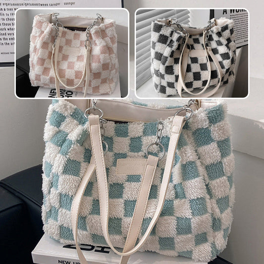 Women's Fashion Plush Plaid Shoulder Tote Bag