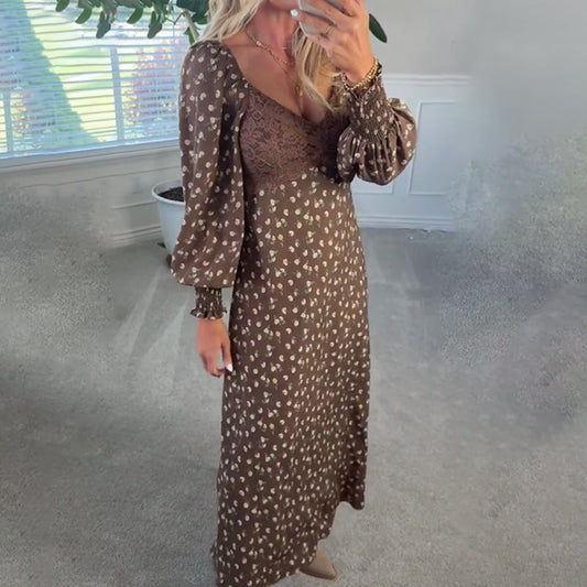 Brown V-Neck Floral Print Dress with Puff Sleeves