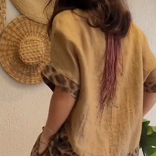 Stylish Patchwork Short Sleeve Top & Wide Leg Pants Two Piece Set