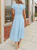 This bold and breezy midi dress has a flattering elastic shirred top, features a crew neck, solid color, high waist, short cap sleeves, edged with playful frills at shoulder, back key-hole closure and a flowy tiered midi skirt, adds more feminine.