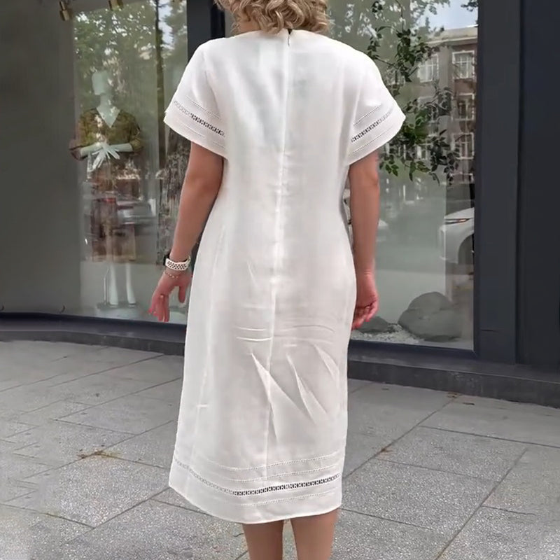 FEMININE DESIGN DETAILS – Delicate mesh accents at the ruffled sleeves and hem add romantic texture. The back zipper ensures easy wear while maintaining the dress's clean lines and elegant simplicity.