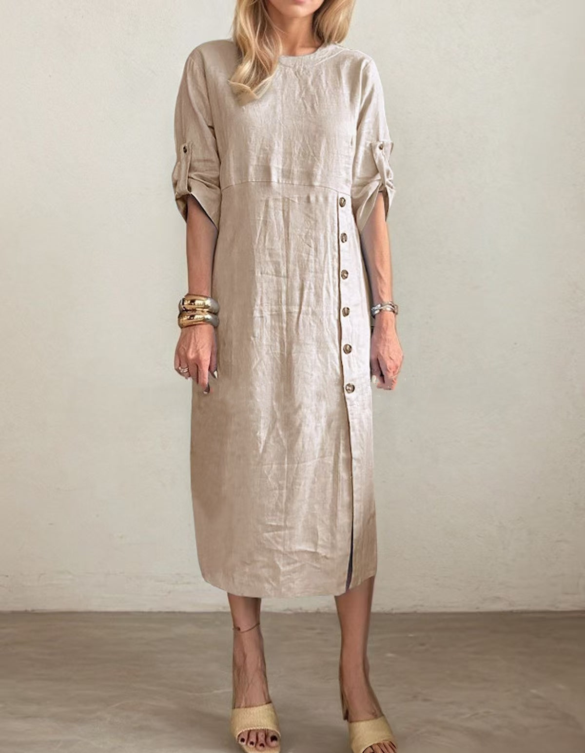 Nothing compares to the lightness and elegance of a cotton linen dress. This Button-Down Side Slit Maxi Dress is the perfect piece for women who value a refined and comfortable style at the same time.