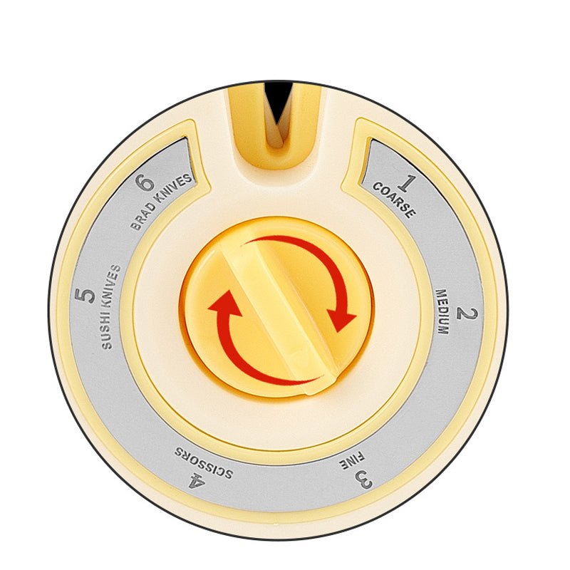 SIX-GEAR ADJUSTMENT - Easily select from six different sharpening modes with a simple turn of the knob. This versatility ensures the perfect sharpening angle and coarseness for various types of knives and scissors.