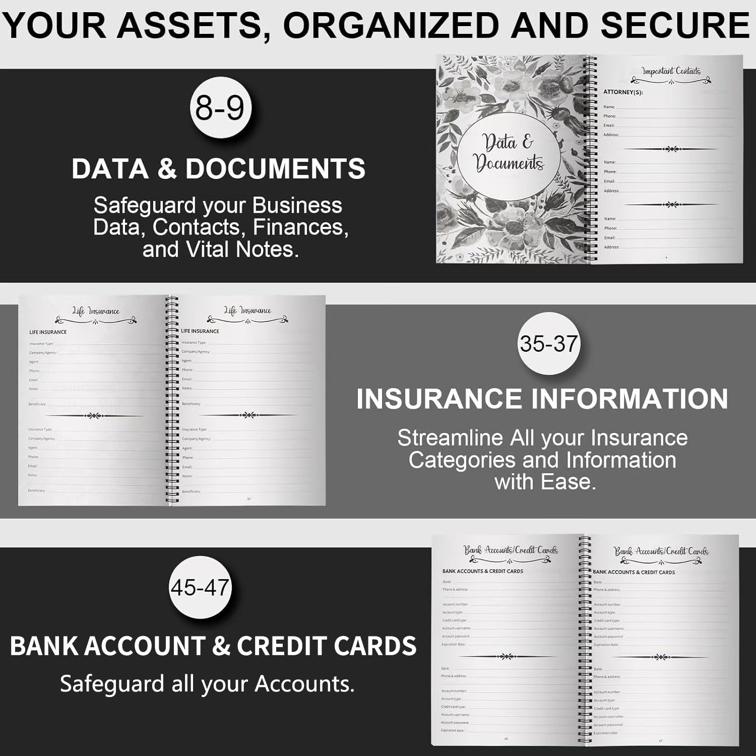 Keep all your important information in one place - dependents, beneficiaries, pets, insurance, accounts, passwords, and more. Each section is clearly organized to ensure nothing is overlooked when it comes to your final wishes.