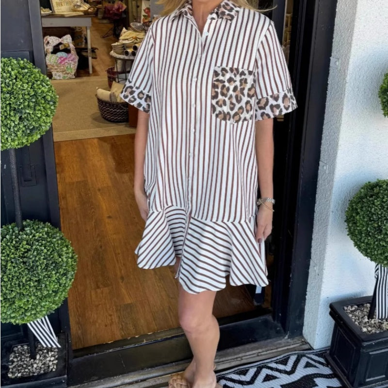 1 × Women's Fashion Striped Patchwork Leopard Print Shirt Dress