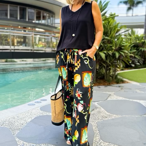 ELEGANT AND TRENDY DESIGN: This chic 2-piece set features a sleeveless top paired with stylish printed wide-leg pants, perfect for an effortless yet fashionable look.