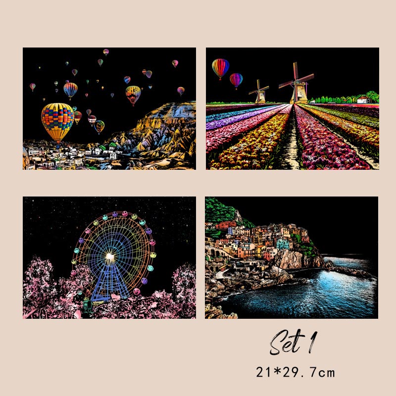 This set includes 4 scratch paintings and all the tools you need for scratching and revealing vibrant colors beneath the surface. Ideal for beginners and experienced artists alike.