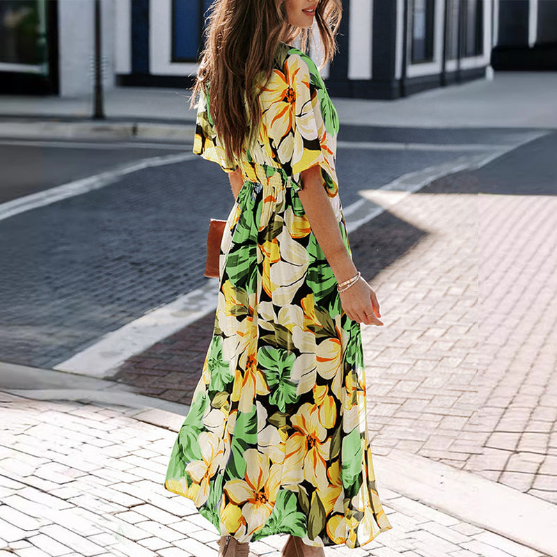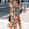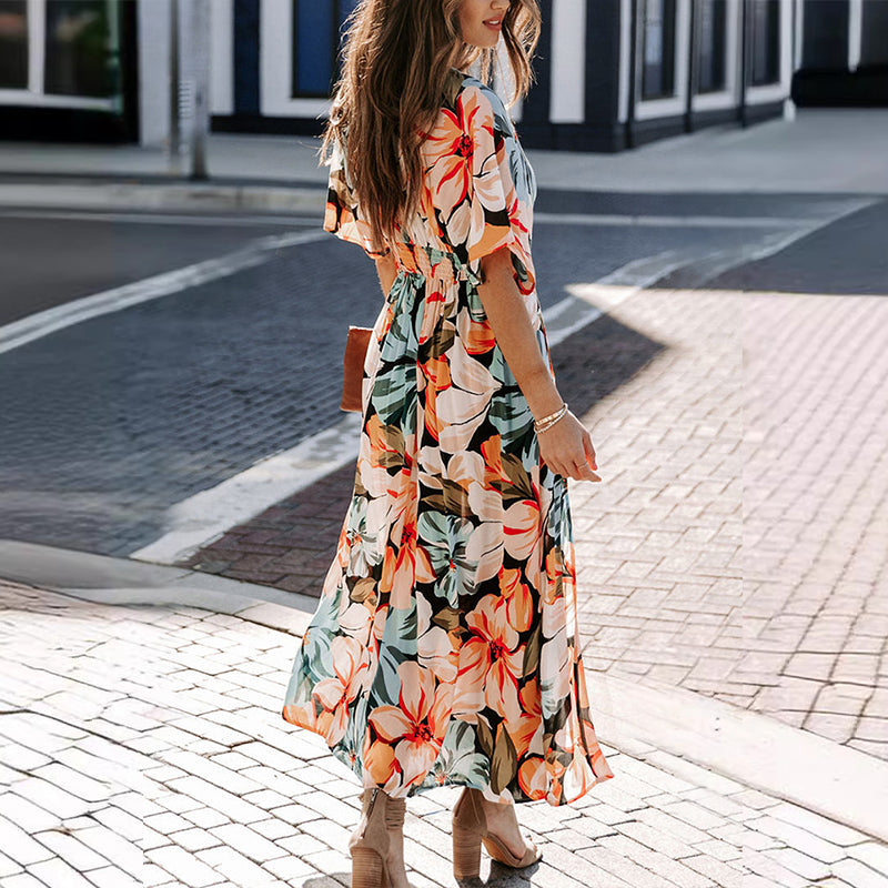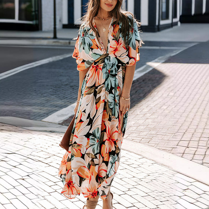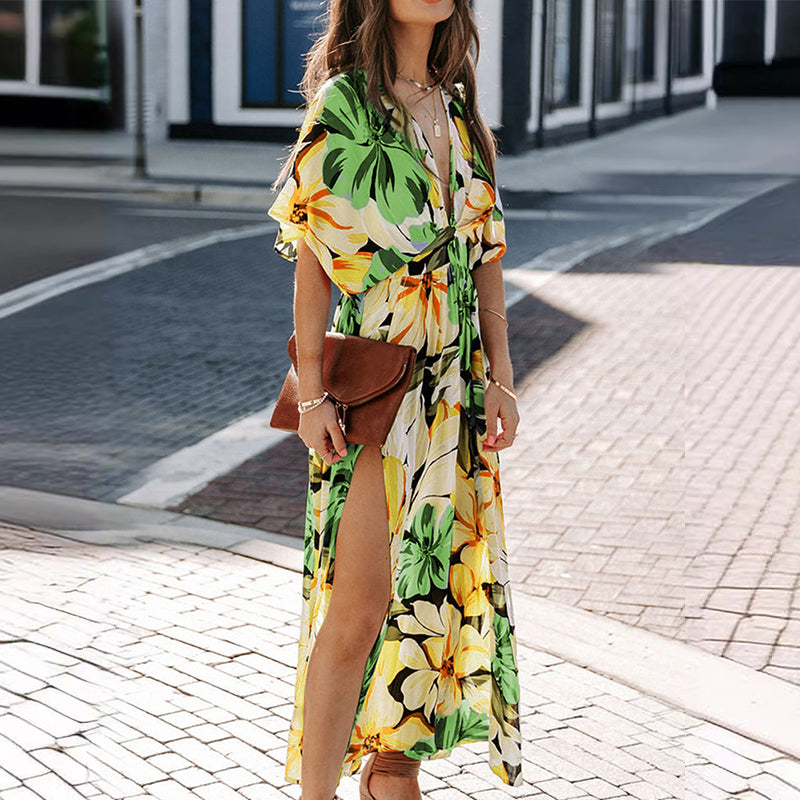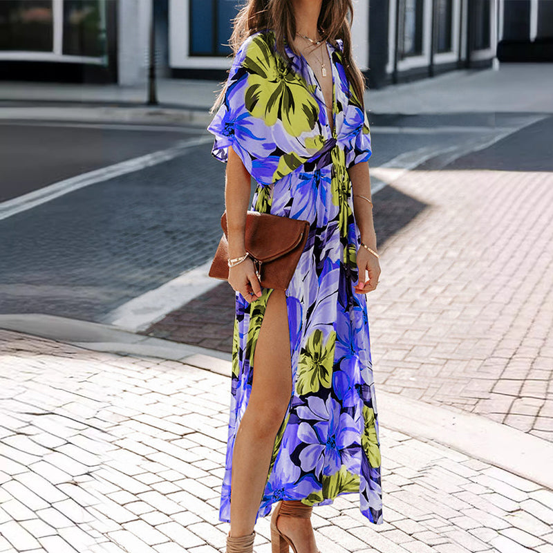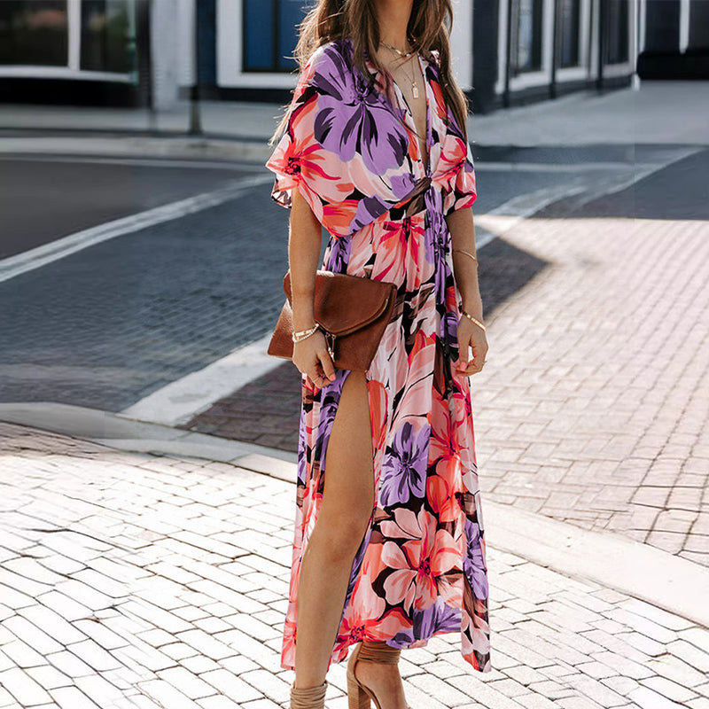 Summer Floral Printed Sexy Deep V-Neck High-Waist Split Dress for Women