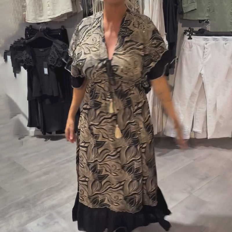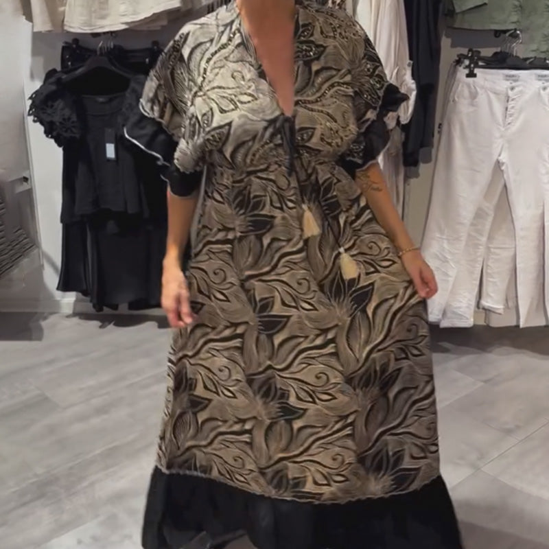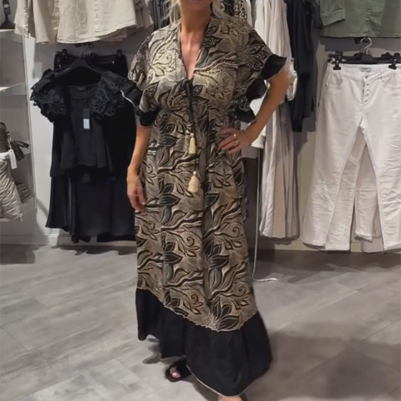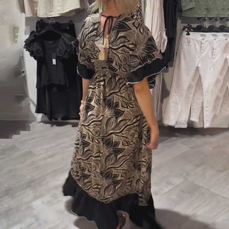 Package Includes: 1×V-Neck Printed Ruffle Maxi Dress