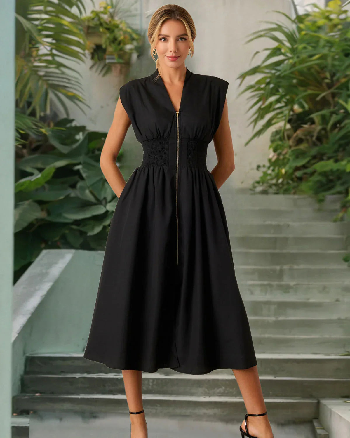 FRONT ZIP CLOSURE – Convenient and Contemporary: Equipped with a sleek front zip, this dress offers both function and fashion. The zipper not only allows for easy wear and removal but also adds a modern accent to the overall look. It ensures a secure fit and a clean, seamless finish from top to hemline.