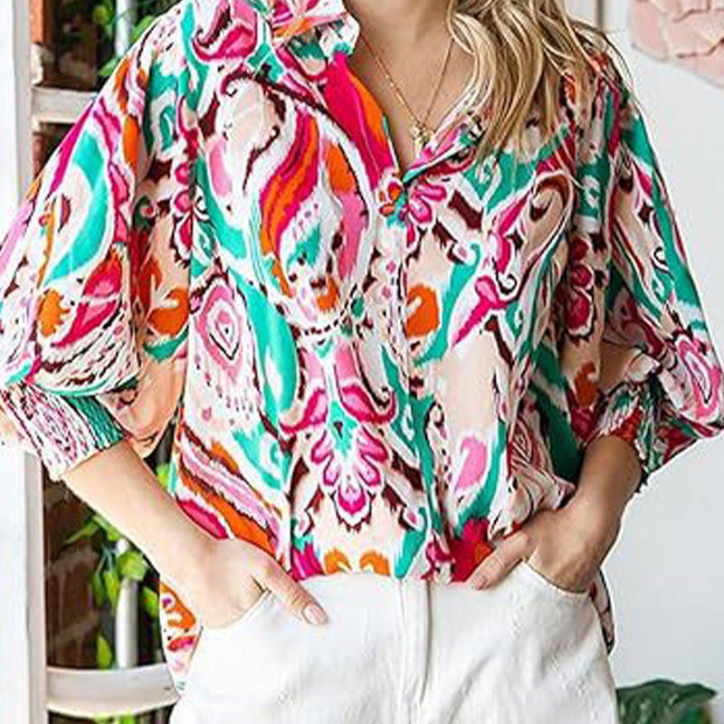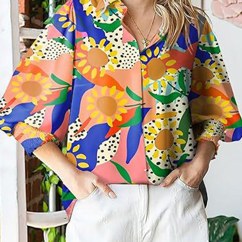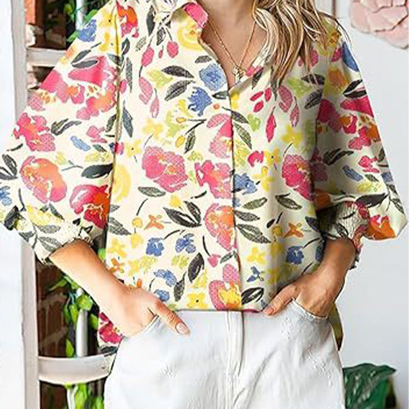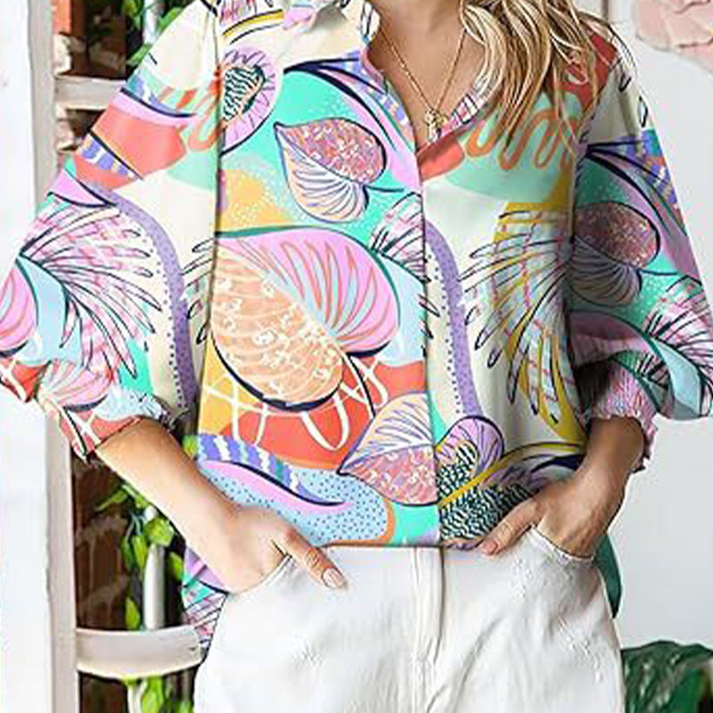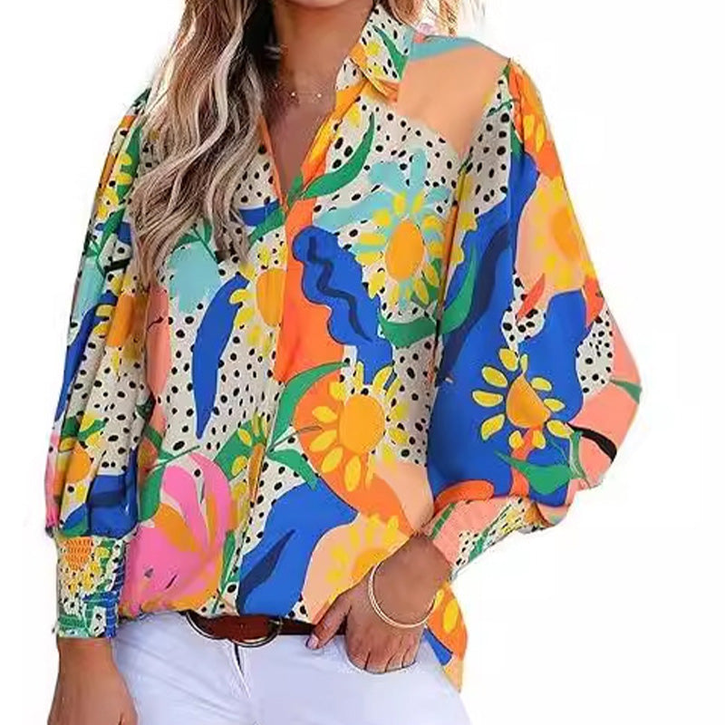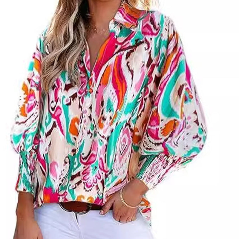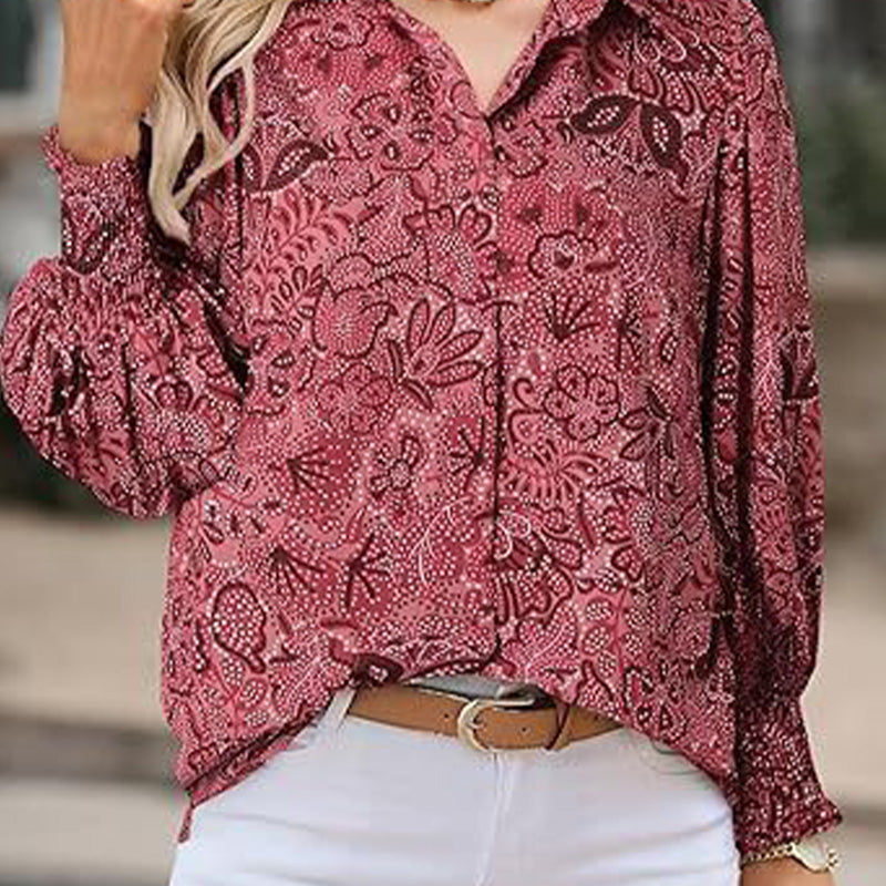 Women’s Printed Button-Down Shirt with Lantern Long Sleeves