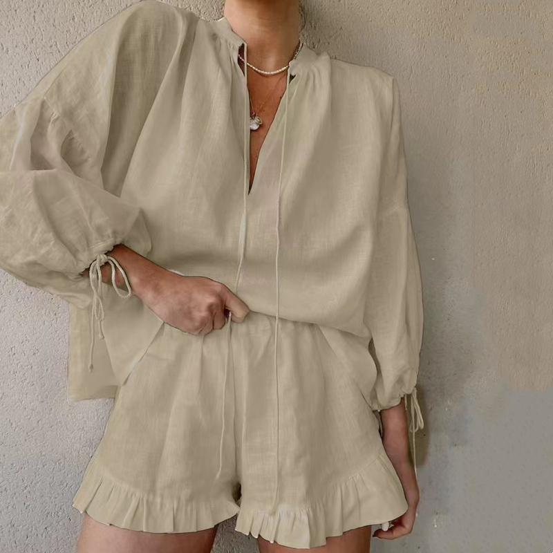 ADJUSTABLE FOR PERFECT FIT – Drawstring cuffs allow sleeve length customization, while the elastic waist shorts ensure a comfortable, secure fit. Dress up with sandals for brunch or keep it casual with sneakers – transitions seamlessly from day to night.