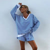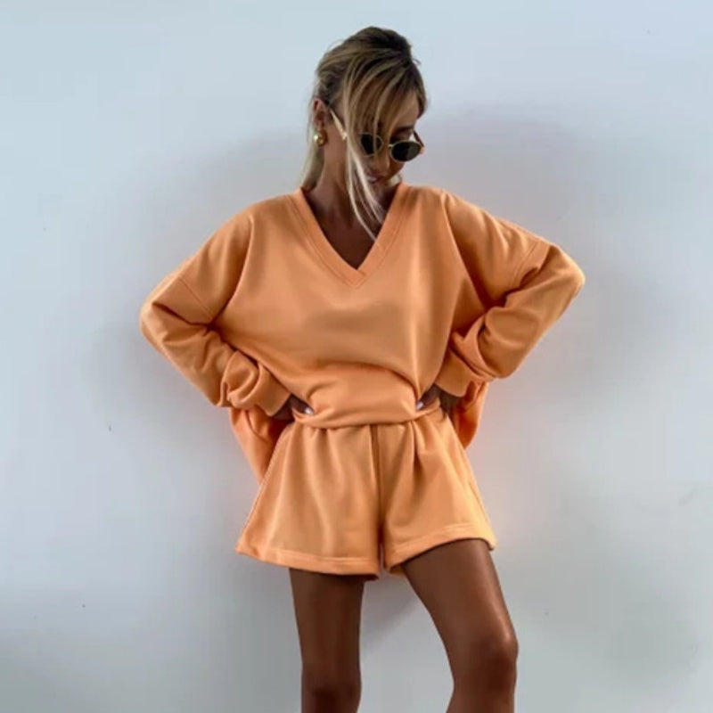 Women's Casual V-Neck Long Sleeve Top & Elastic Waist Shorts 2-Piece Set