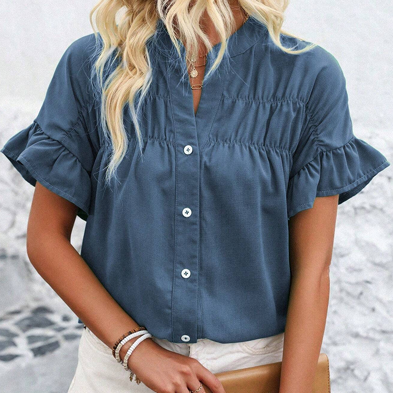 FLARE SHORT SLEEVES & LOOSE FIT- Designed with flared short sleeves, this top is refreshing and comfortable, perfect for summer. The ruffle detail adds an elegant touch, making it both stylish and practical.