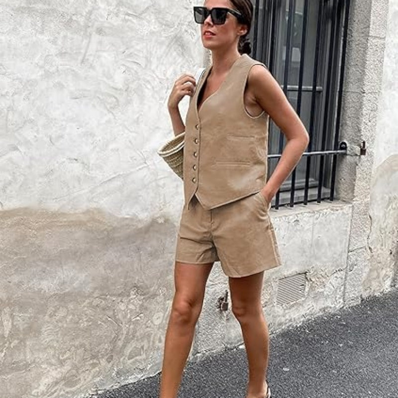 ELEGANT V-NECK DESIGN - The sleeveless V-neck top offers a flattering neckline that adds a touch of sophistication to this casual two-piece set, making it ideal for both daytime and evening wear.
