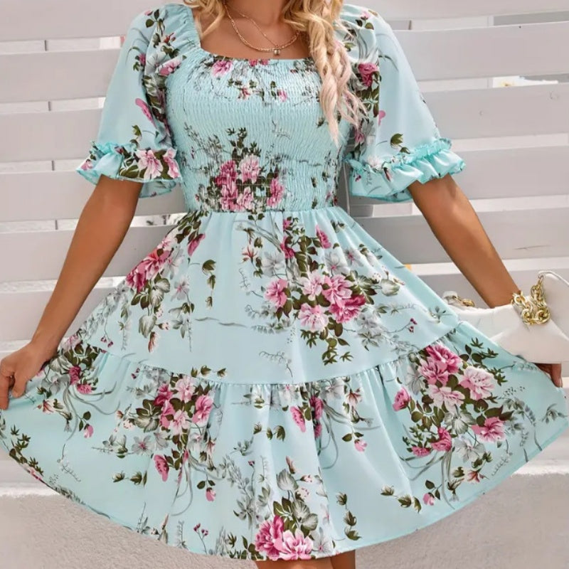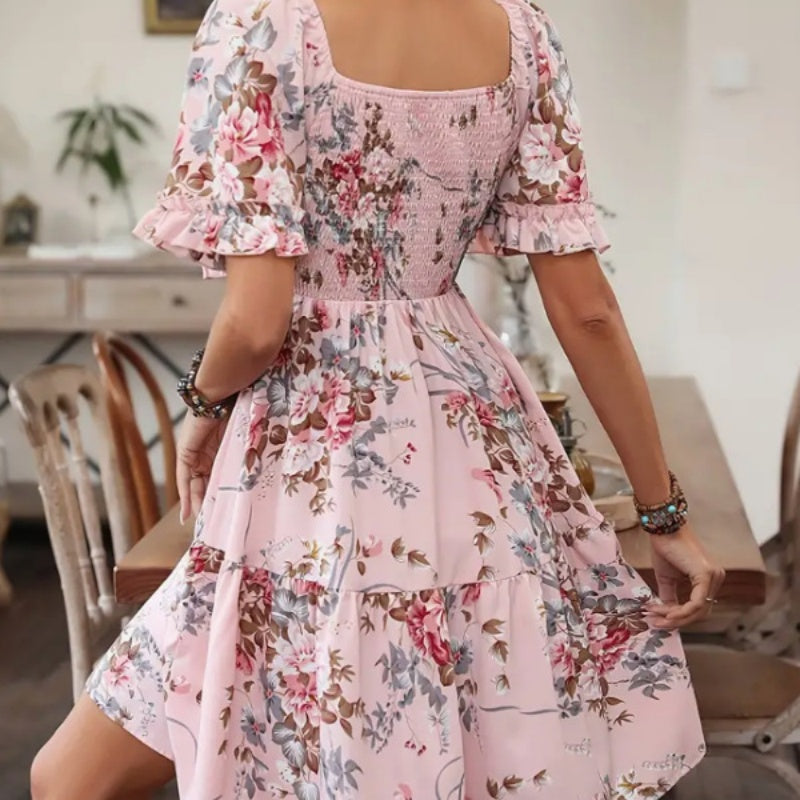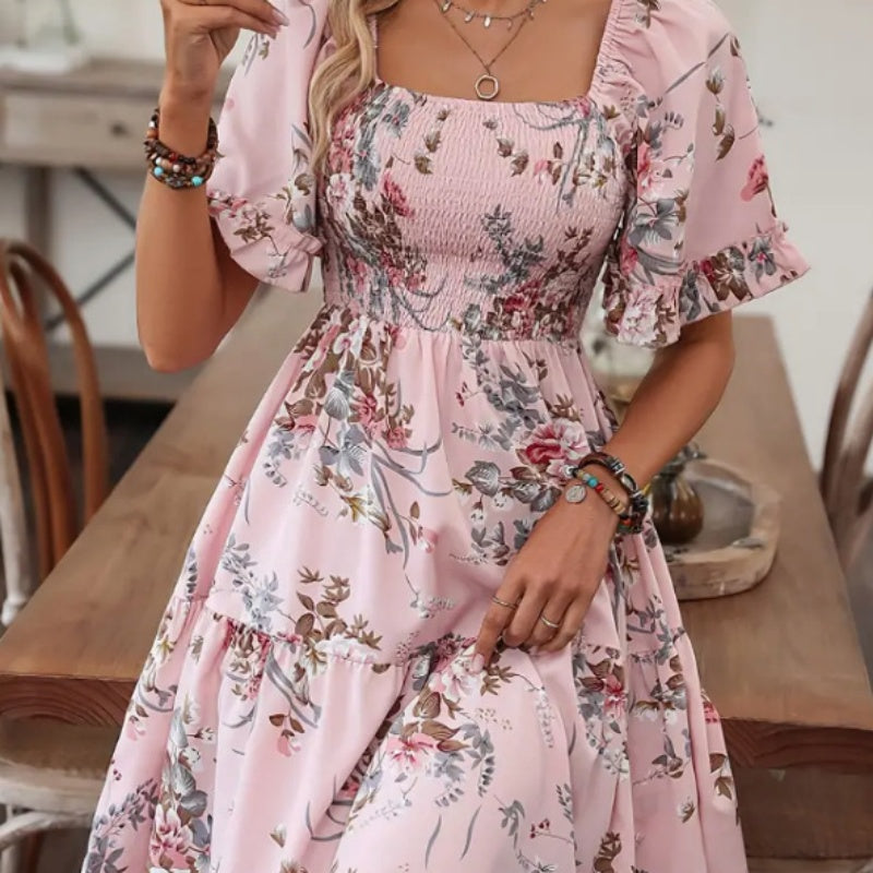 Women’s Elegant Square Neck Floral Print Smocked Dress