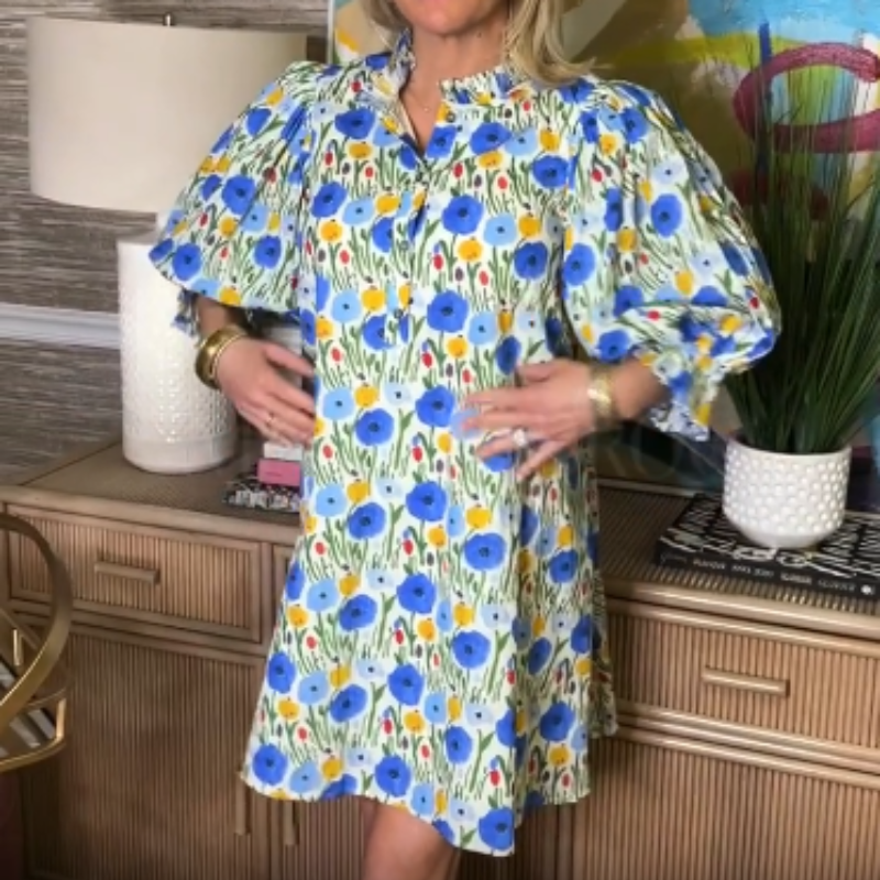 Women's Floral Printed Belted Bubble Sleeve Dress