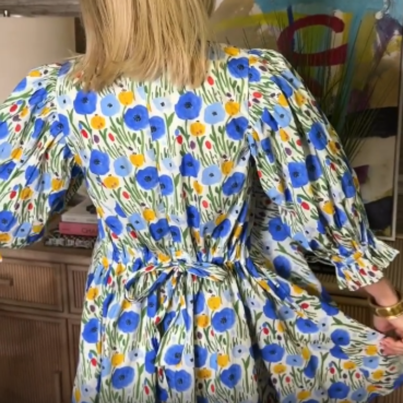 ROMANTIC FLORAL PRINT: Delicate sky blue blossoms on a contrasting background create a timeless, eye-catching pattern. The vibrant yet subtle print transitions effortlessly from daytime brunches to evening events with simple accessory changes.