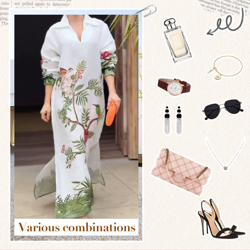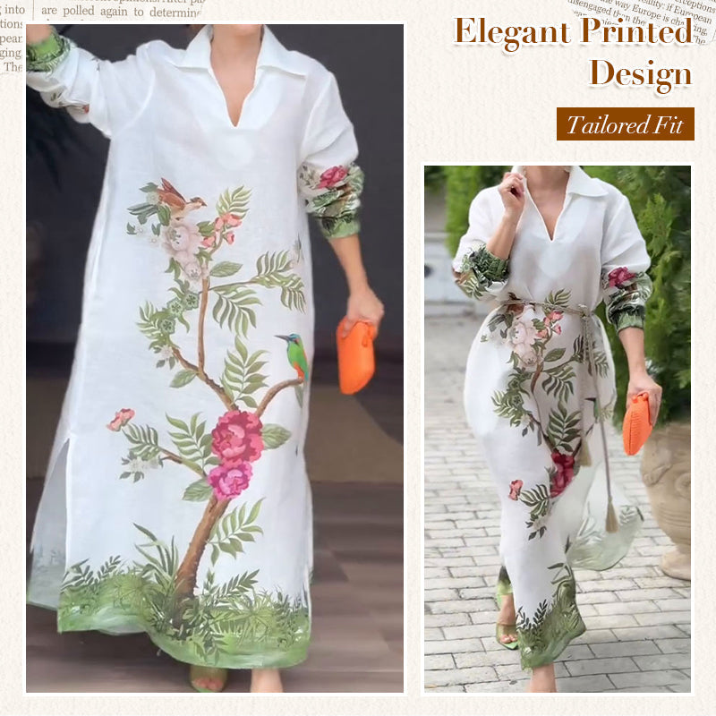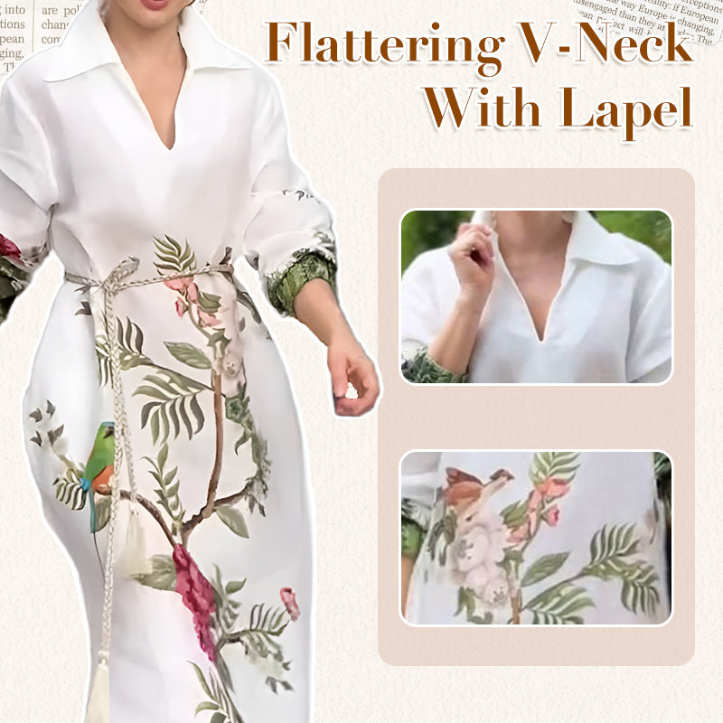 🌸Limited Sale 50% OFF🌸Women’s Print V-Neck Lapel Long-Sleeve Long Dress