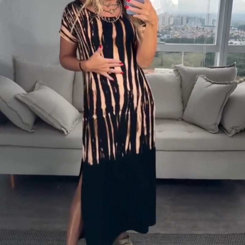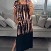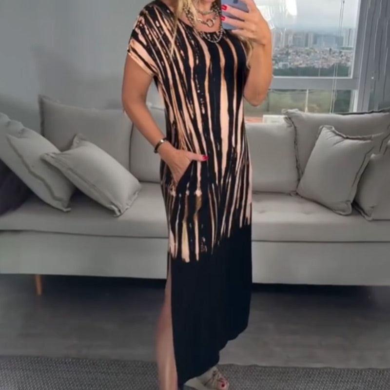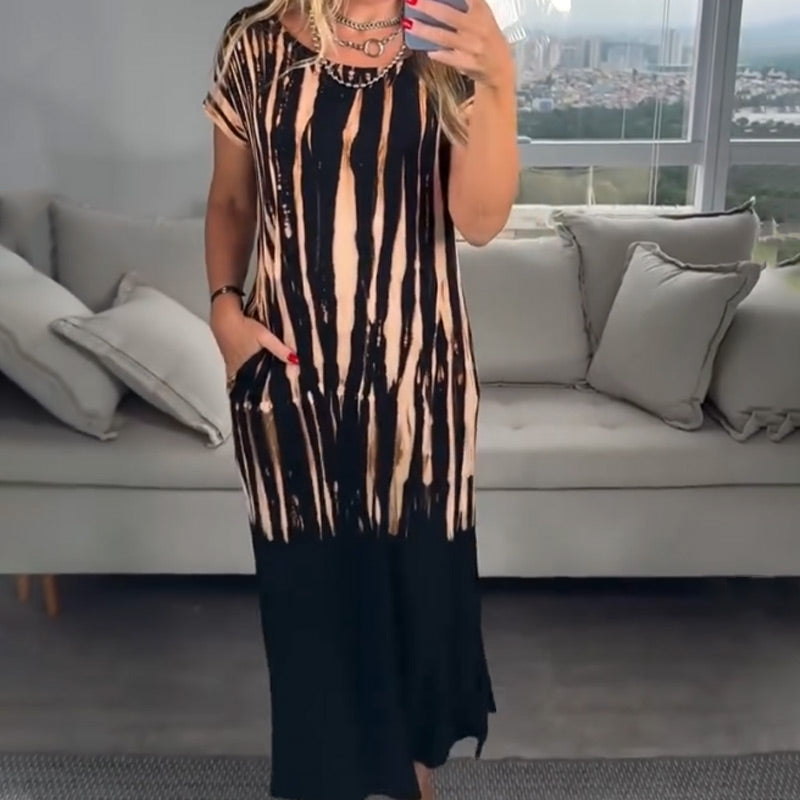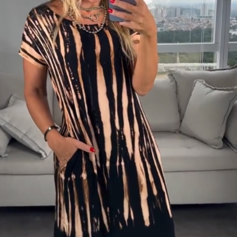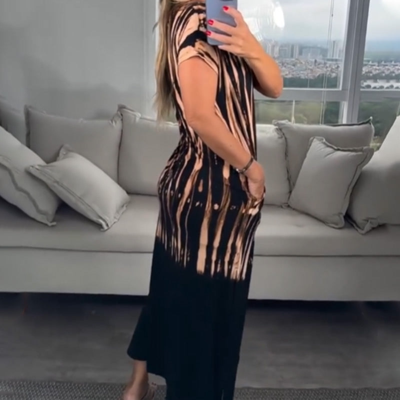 ARTISTIC PATTERN: The dress features an eye-catching pattern in shades of black and beige, with vertical stripes that create a striking and fashionable look, making it an instant standout piece.