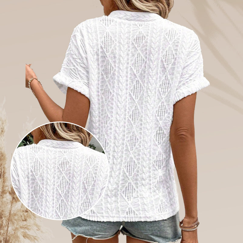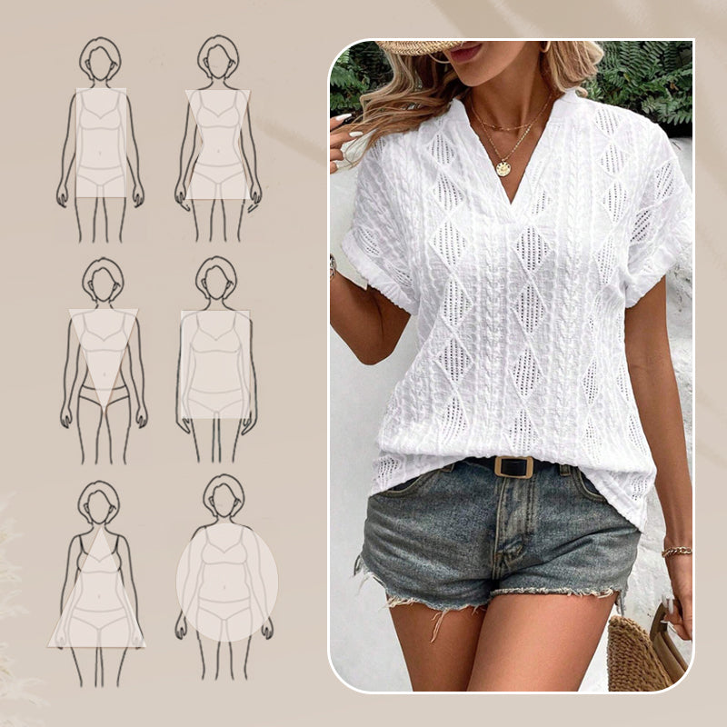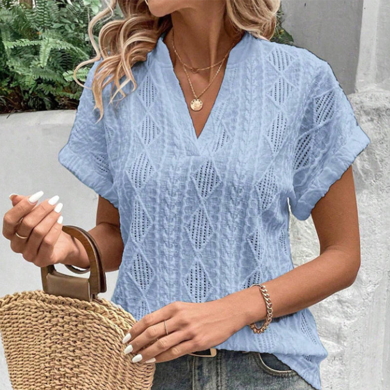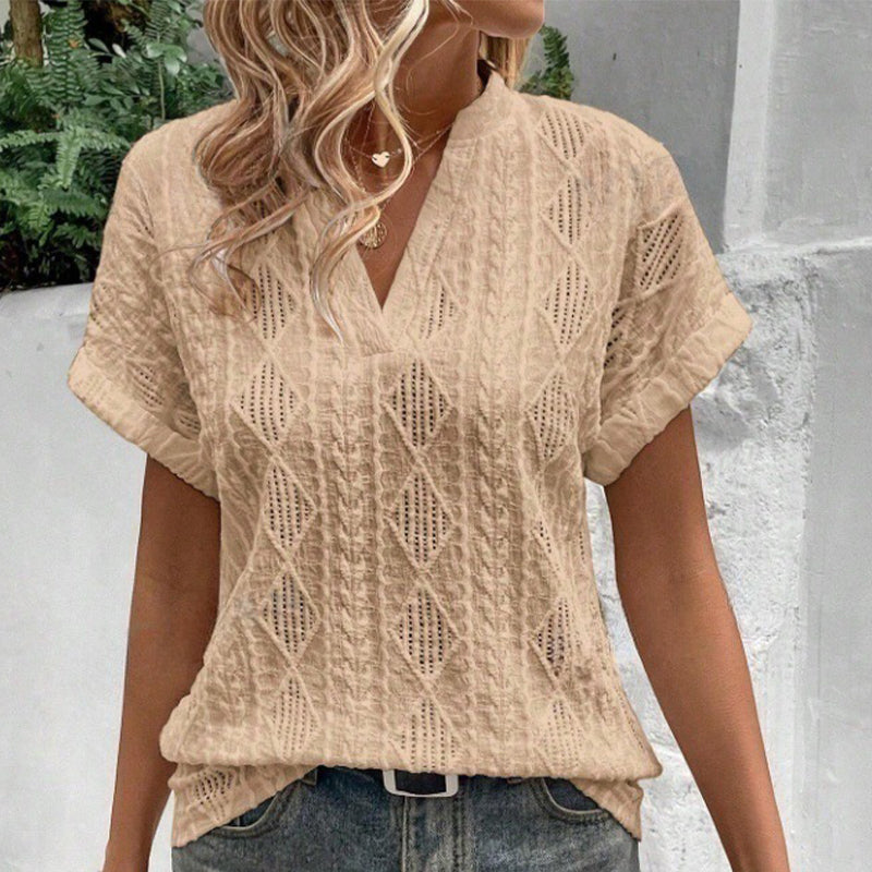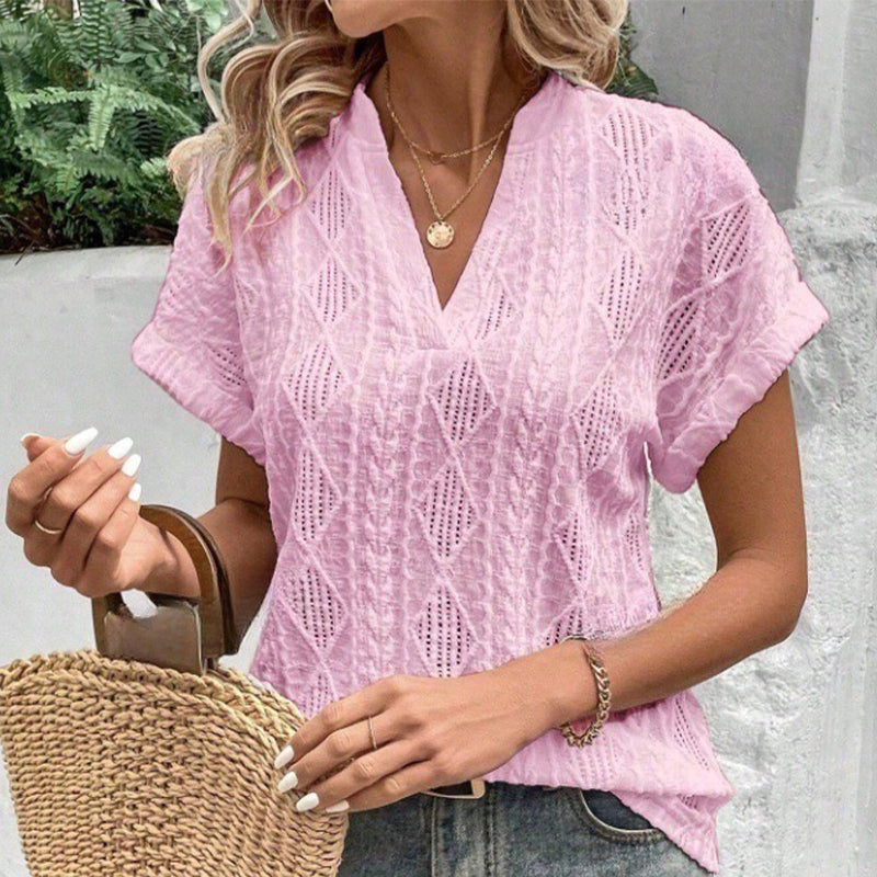 Women's V-Neck Jacquard Short Sleeve Loose Shirt