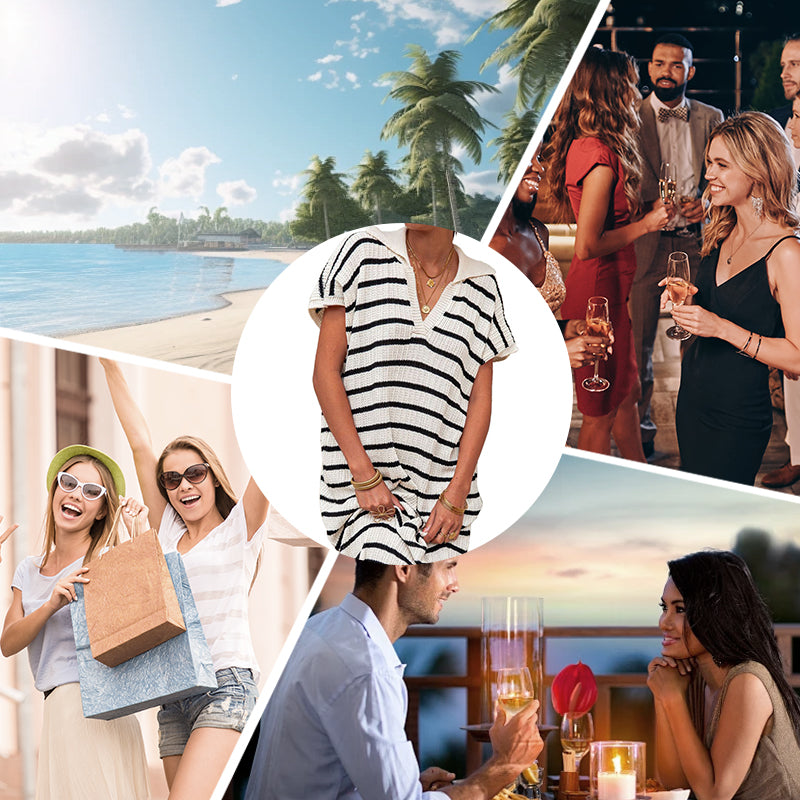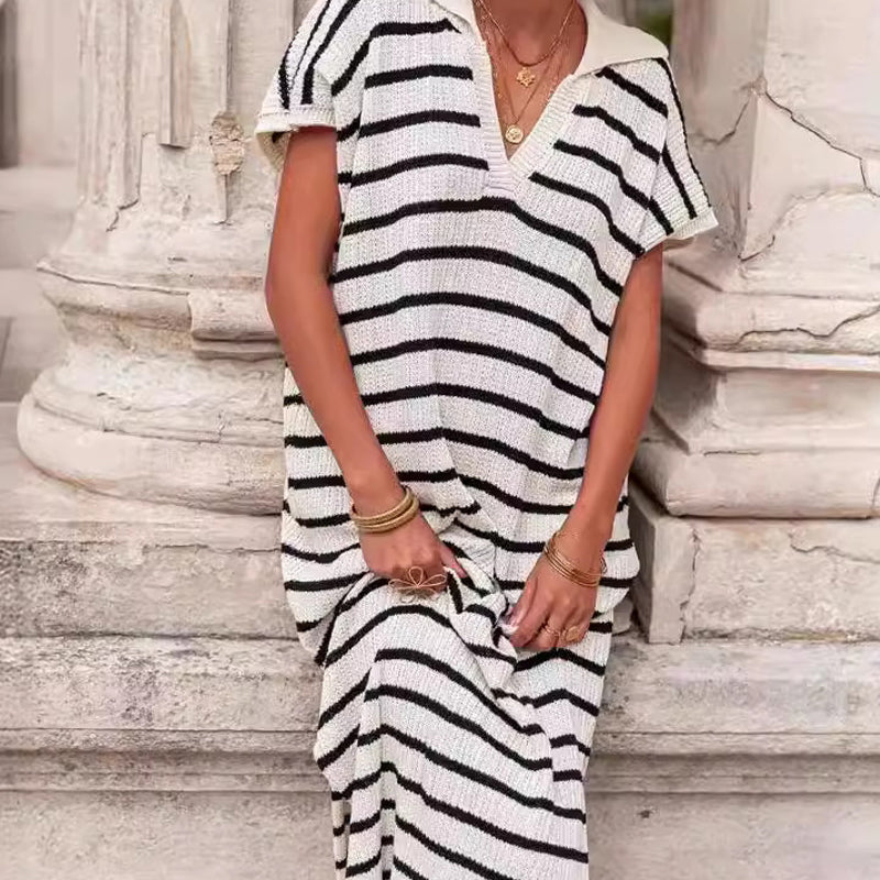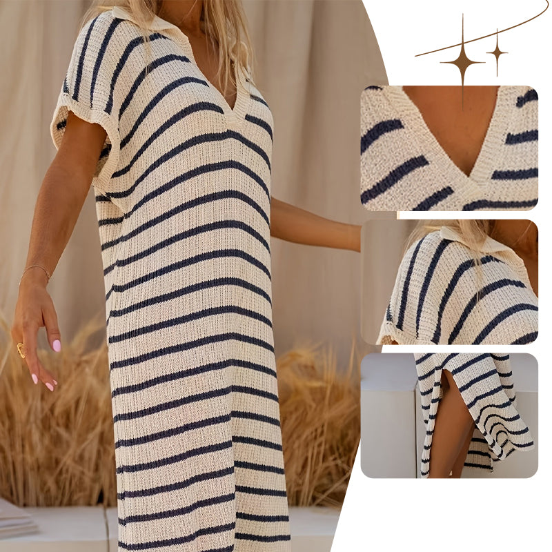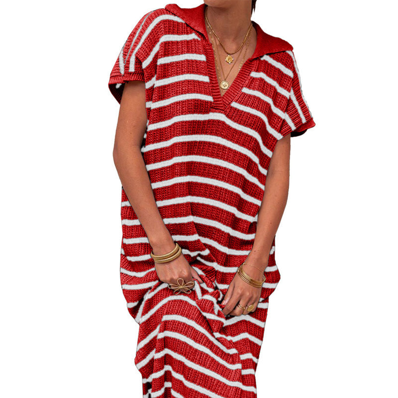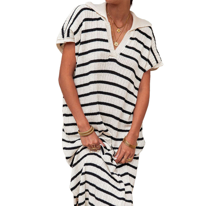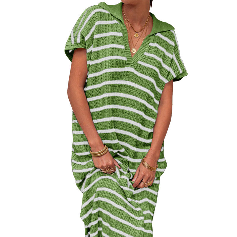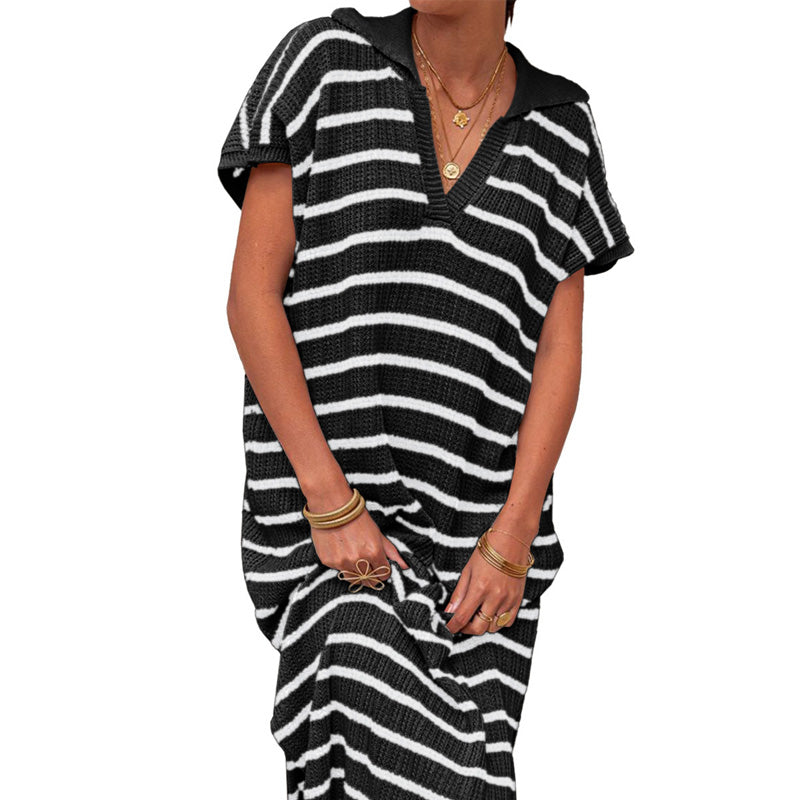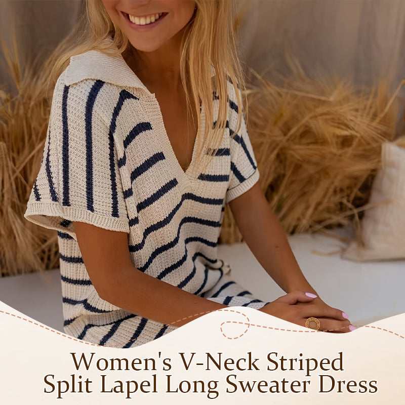 Women's V-Neck Striped Split Lapel Long Sweater Dress